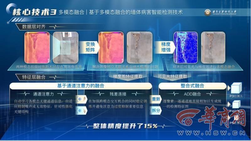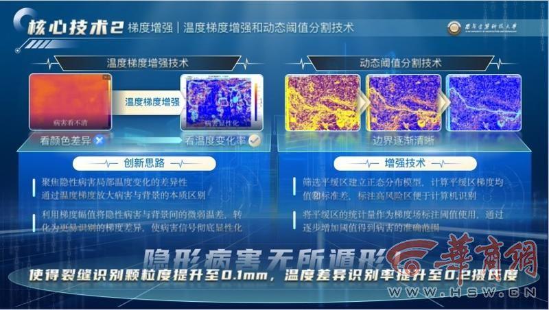 随着研究深入,红外图像中伪热点干扰多、特征纹理模糊、边界不清晰等问题逐渐凸显。团队创新提出温度梯度增强与动态阈值分割技术,将识别依据从传统的“颜色差异”转向“温度变化率”,最终实现了对0.1毫米级裂缝与0.2摄氏度温差的精准识别,使各类“隐形病害”清晰可辨。