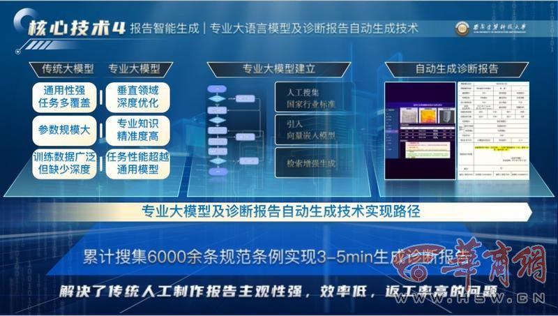 针对传统检测报告依赖人工、主观性强、效率低下的问题,团队构建了涵盖6000余条国家、行业及地方标准的结构化知识库,结合增强检索与大模型技术,实现了专业诊断报告的自动生成。原本需要数小时完成的报告,如今仅需3–5分钟即可输出,在显著提升效率的同时,也保障了评估结果的标准化与客观性。